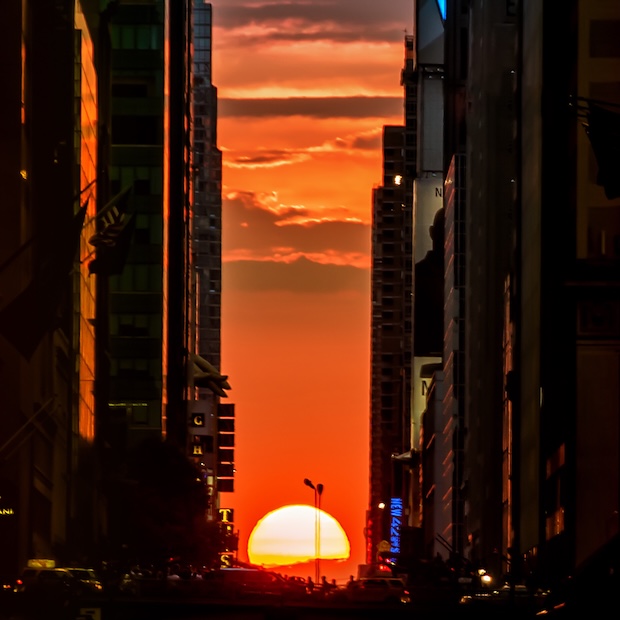 Look at that–it’s aligned! The sun is squarely in the middle of the road and partly under the horizon at May 29th, 2022 at 8:13 p.m., which matches the time listed in the table on the Manhattanhenge Wikipedia page for the half-sun time.