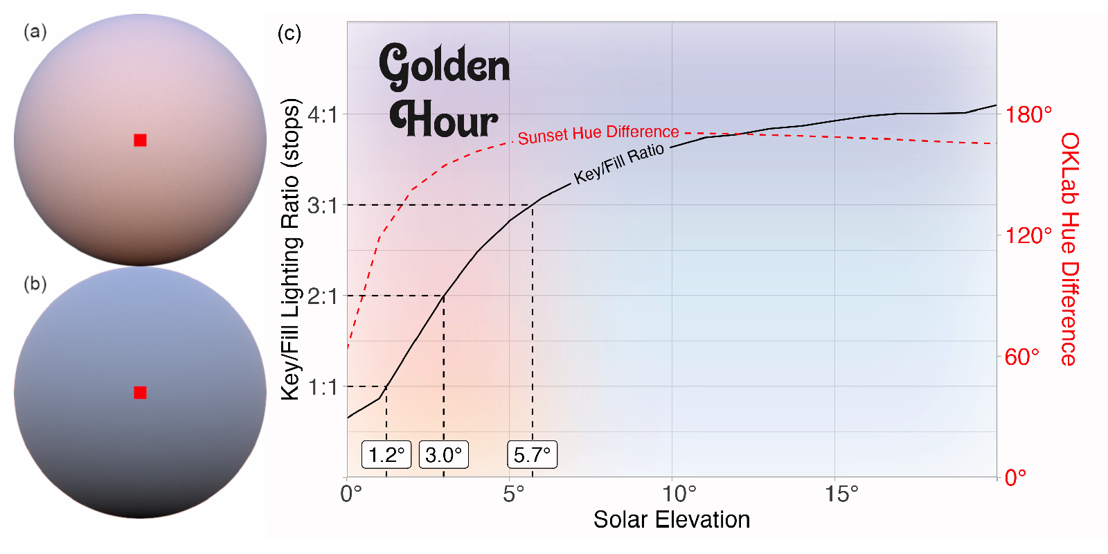 There are two properties of sunsets that make for great photos, and thus (for our purposes) great 3D renderings. First, the atmosphere greatly attenuates direct sunlight close to sunset, making the difference between the direct and indirect lit areas on the subject much less stark, often described as the lighting ratio in cinematography. This lowers the contrast, softening those sharp lines. Cinematographers often target lighting ratios between 3:1 and 2:1 (in stops, which scale as \(2^s\); 8:1 to 4:1 in linear terms) for illuminating faces1. Second, the thicker atmosphere at lower solar elevation angles scatters more short-wavelength light from the sun, producing warmer tones at sunrise. This dependence on solar elevation leads us to a fairly common definition of “golden hour:” when the sun is around -6\(^\circ\) to ~6\(^\circ\) from the horizon.