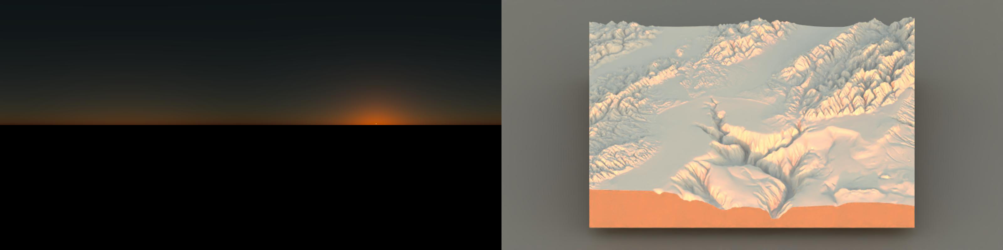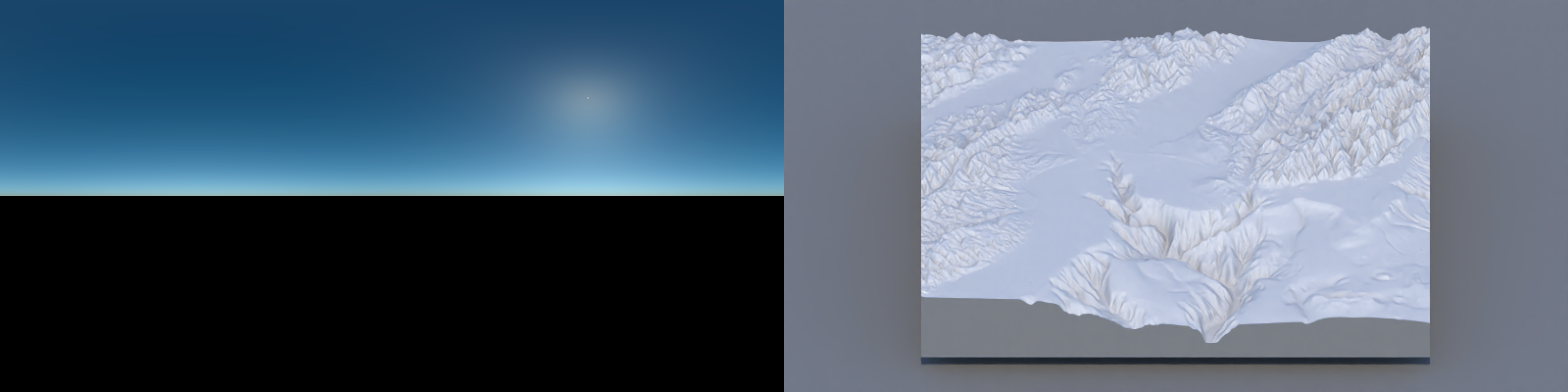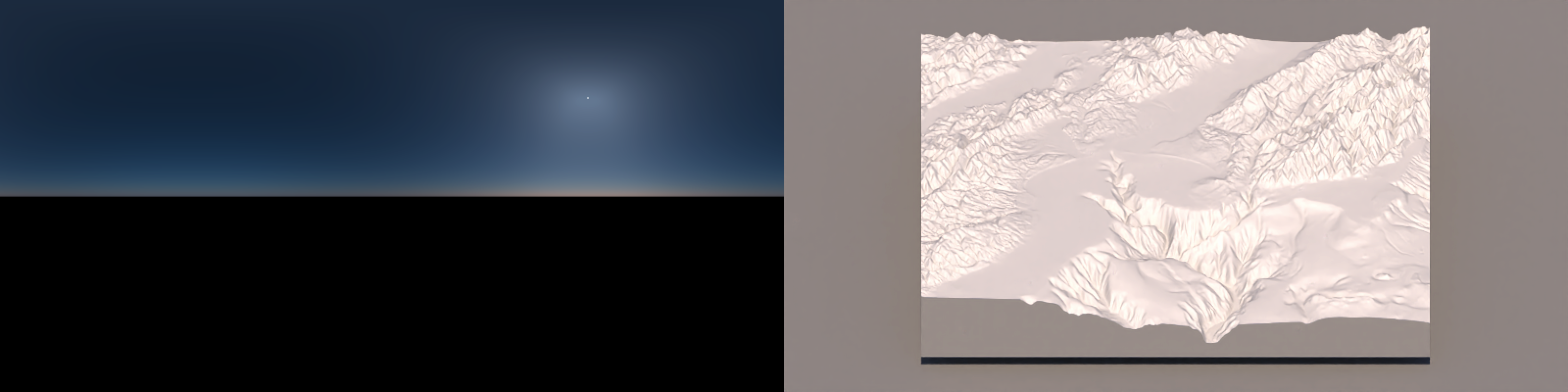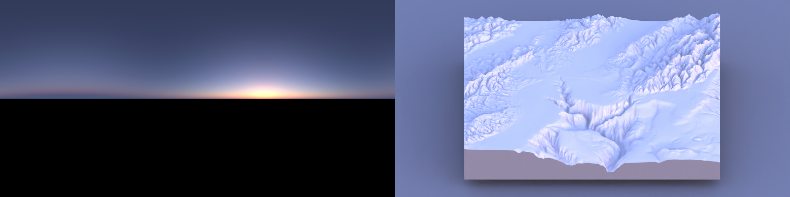 One of the hardest details to get right in 3D data visualization is lighting: since 2D screens don’t offer the benefit of stereoscopic vision, we have to rely on subtle cues like occlusion, relative motion (if animated), and shading to be able to interpret the space as 3D. Nowhere is this more clearly demonstrated than on topographic maps, where shadows can make what is otherwise a largely featureless blob of color transform into a landscape. Add direct light with diffuse shading to a model, and voilà: