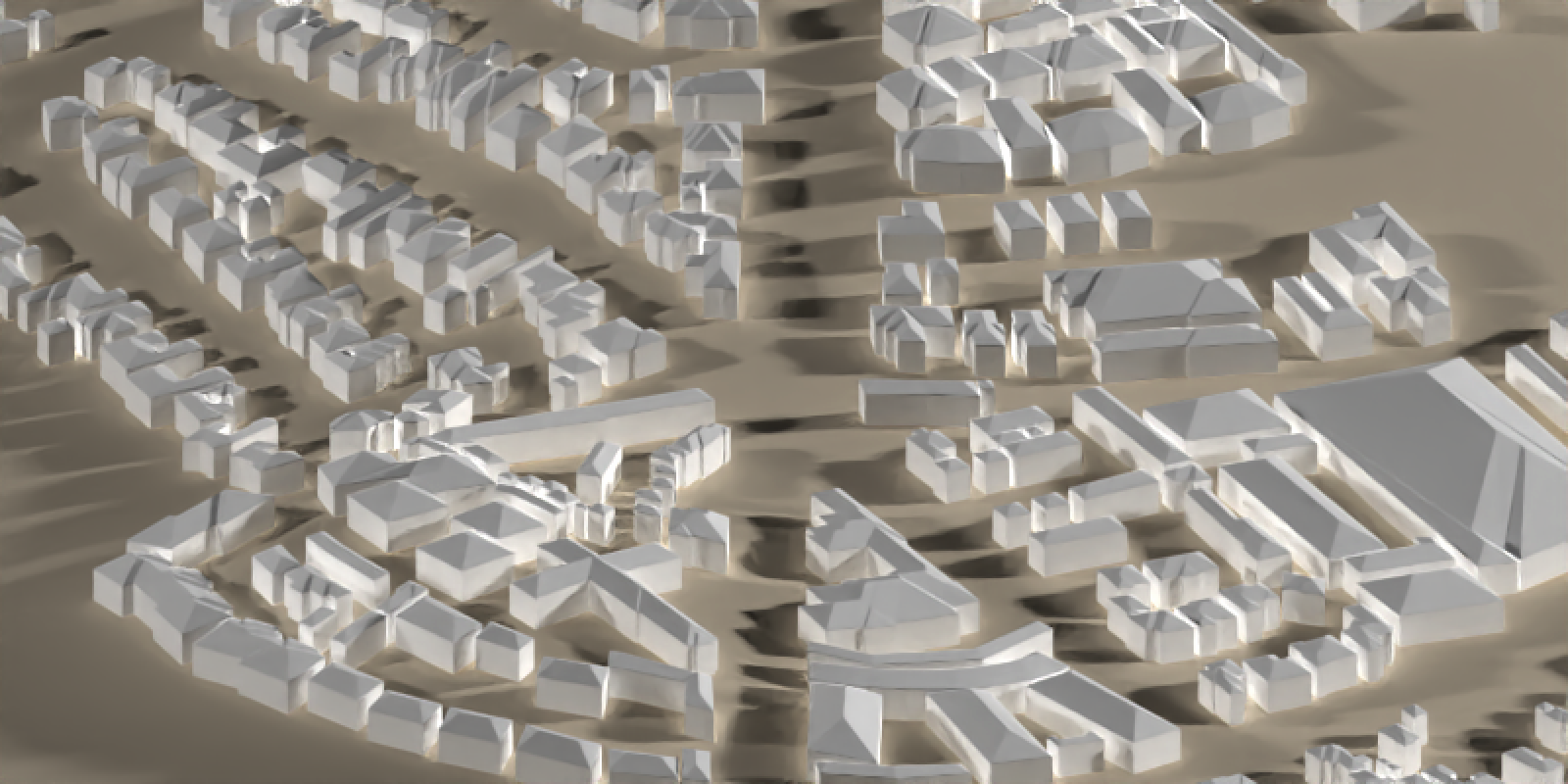 You can see the two lights now create two separate shadows, on top of the shadows from the terrain. With one building on a relatively flat surface it isn’t too bad, but with many buildings or a more complex landscape, all the overlapping shadows can add a lot of visual clutter and noise to an image. To demonstrate, let’s render a fairly normal town center: Figure 6 shows an intersection surrounded by buildings in Monterey, California.