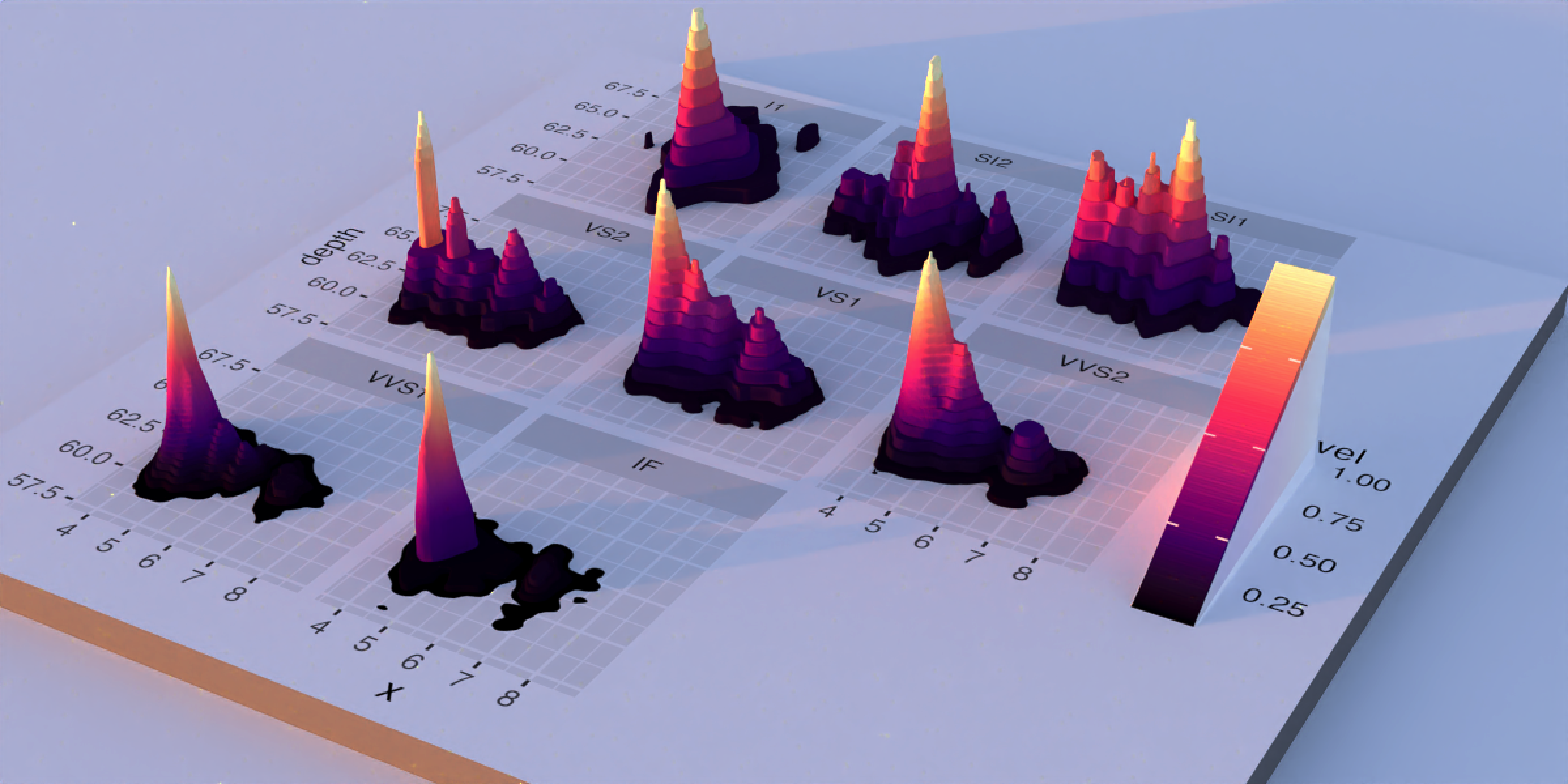 Now that we’re done probing the package’s ability to generate realistic spatial scenes, let’s see if it provides nice lighting for a purely abstract visualization. We’ll try it out with a 3D ggplot from rayshader, using my favorite 3D ggplot demo: a faceted 3D density plot of the diamonds dataset.