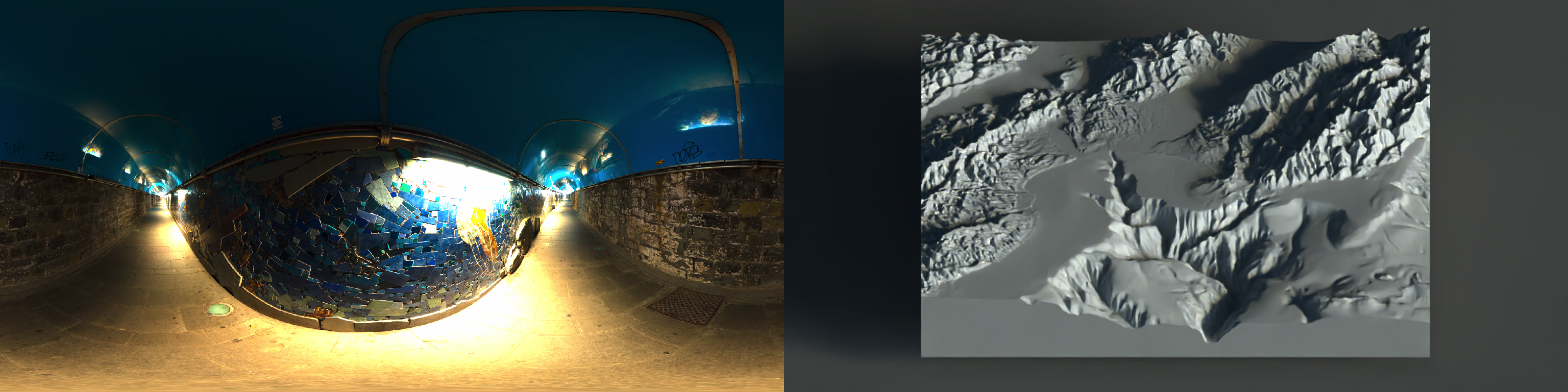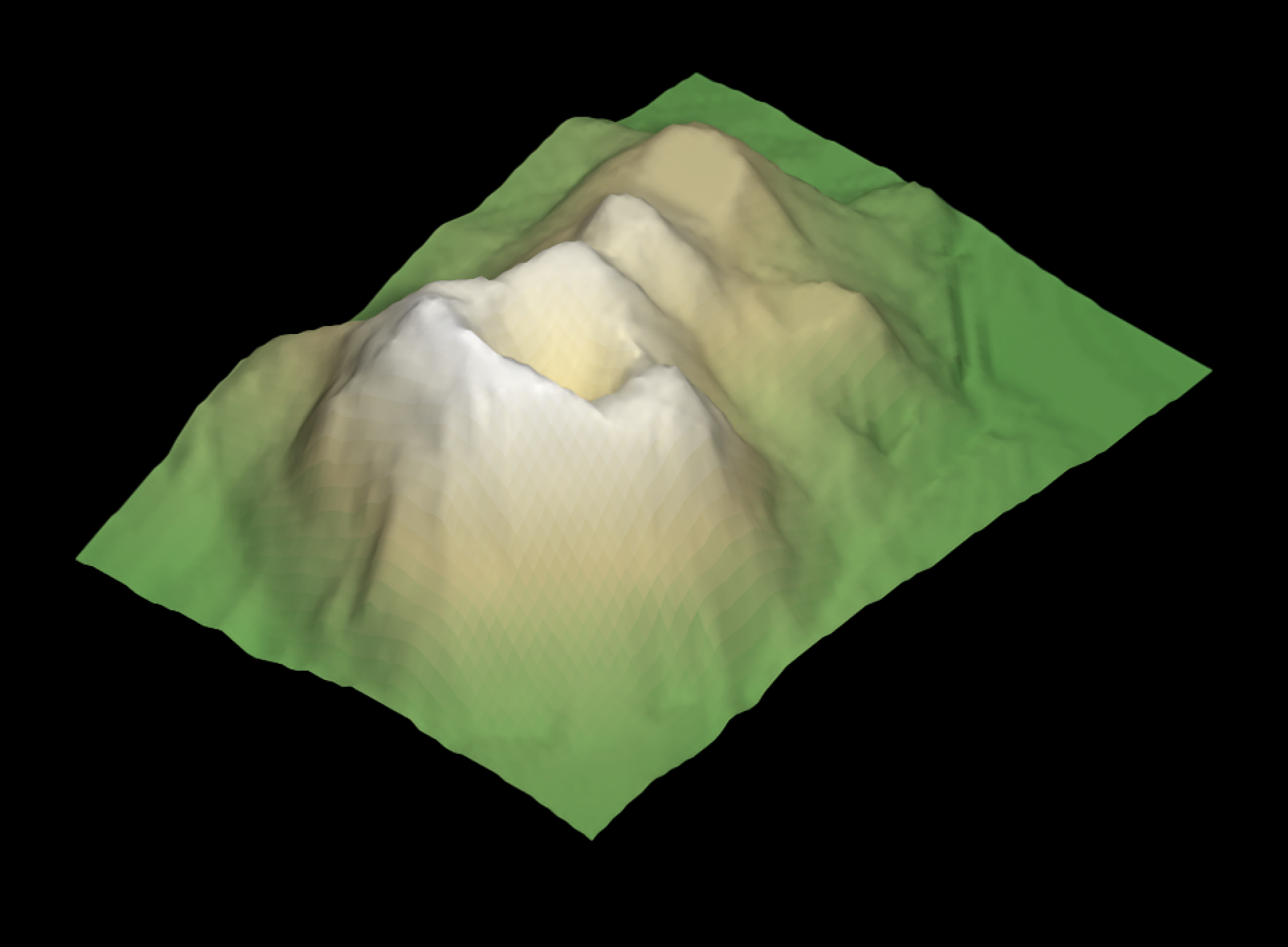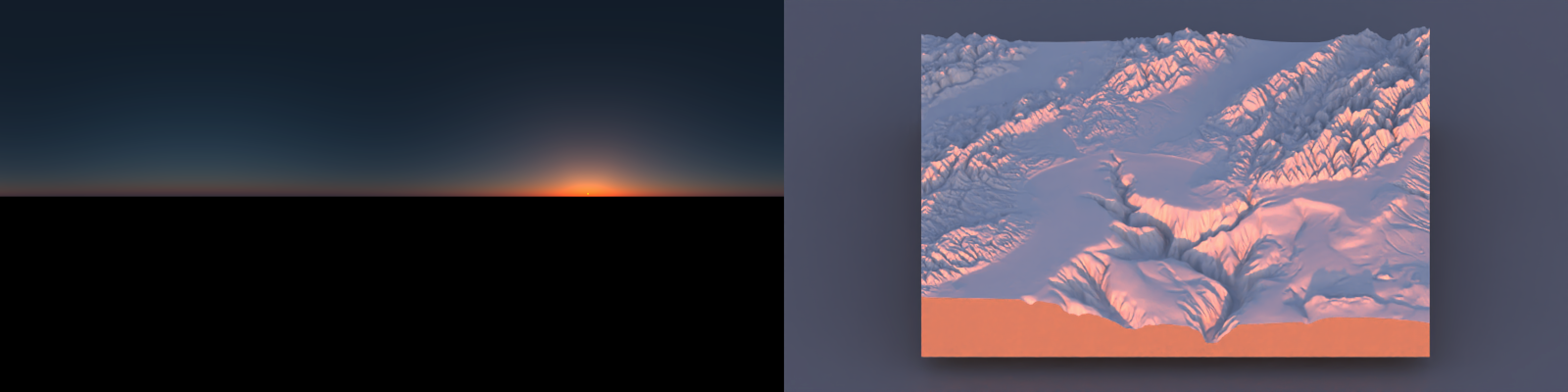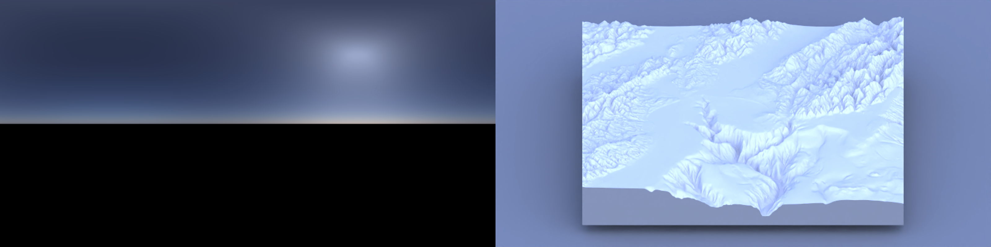One of the hardest details to get right in 3D data visualization is lighting: since 2D screens don’t offer the benefit of stereoscopic vision, we have to rely on subtle cues like occlusion, relative motion (if animated), and shading to be able to interpret the space as 3D. Nowhere is this more clearly demonstrated than on topographic maps, where shadows can make what is otherwise a largely featureless blob of color transform into a landscape. Add direct light with diffuse shading to a model, and voilà: