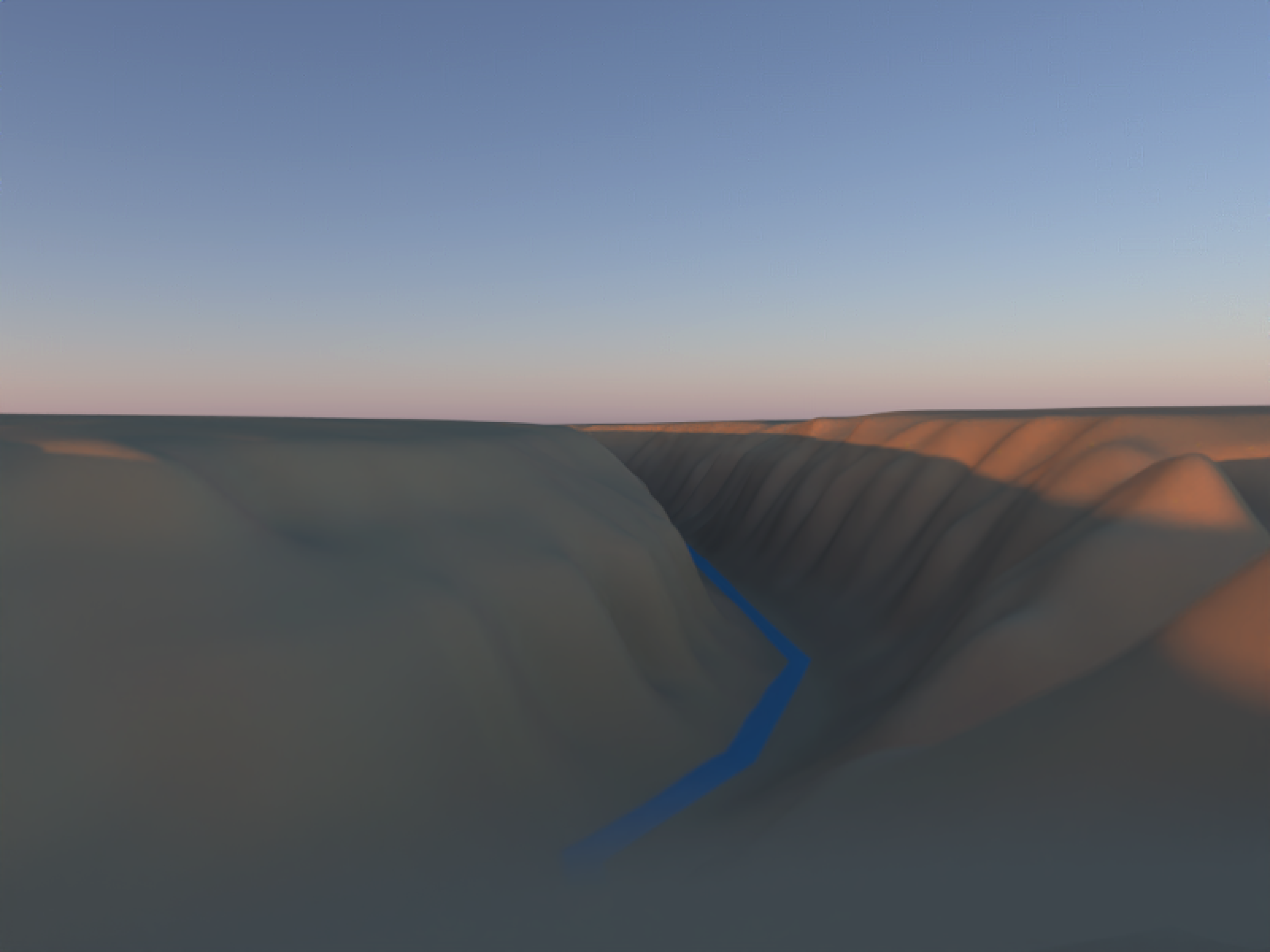 Note that the sunset still gives a relatively bright highlight on the mountaintops, but the shadows otherwise are fairly soft throughout the terrain. And while the highlights are significantly brighter than the shaded regions, the bright and dark regions aren’t too different: we have just the right amount of contrast.